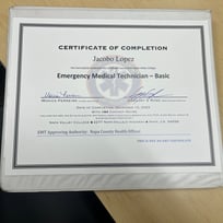 To become an EMT, I enrolled in two required courses at my local school, Napa Community College: EMT-90 First Responder and EMT-95 Emergency Medical Technician. The courses were led by Greg Scott Rose and Monica Ferreira, both experienced Paramedics who have served the Napa Community for several years. We were fortunate to have skilled instructors, including EMTs and paramedics, who guided us in developing the necessary skills for EMT competence.
